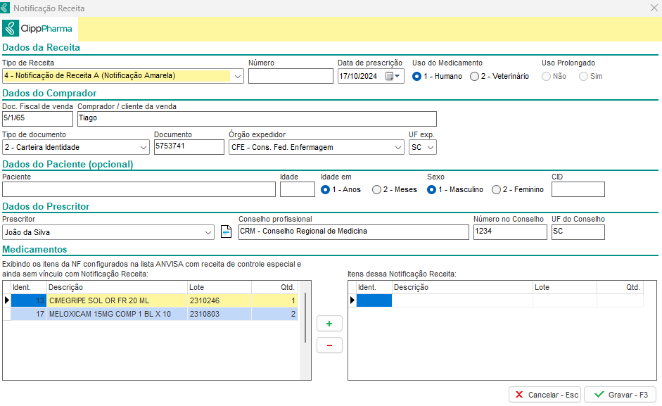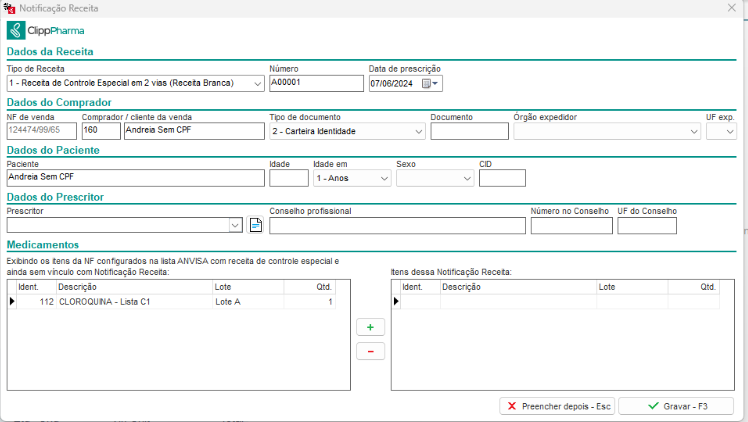 Este campo poderá ser preenchido no momento de finalização da venda ou clicando em Preencher depois - Esc, poderá efetuar o preenchimento no módulo do ClippFarma.