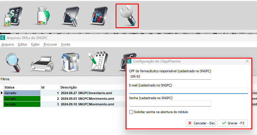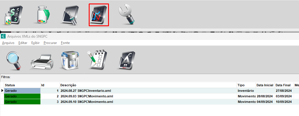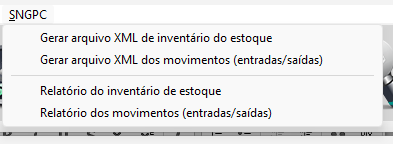 SNGPC: Há opções disponíveis para gerar o inventário, bem como os arquivos e relatórios de movimentação dos produtos controlados.