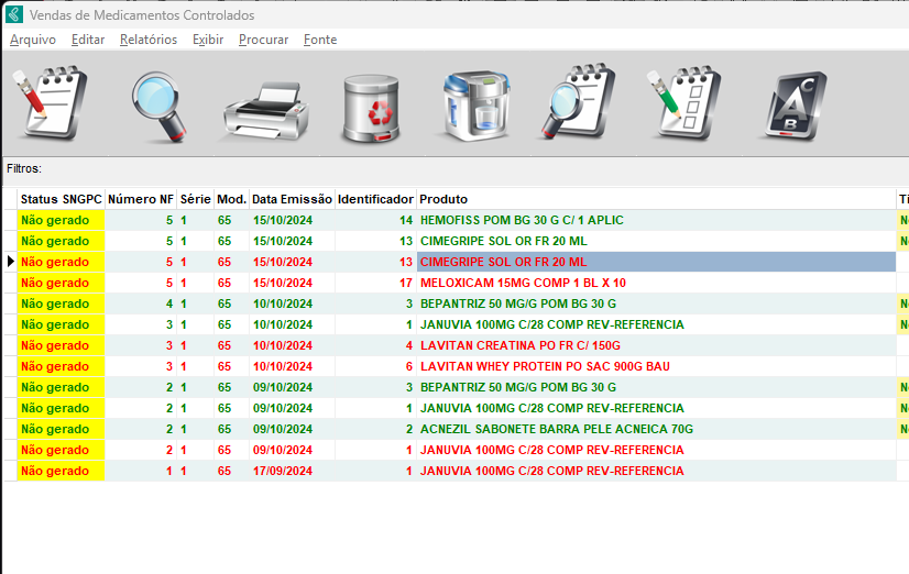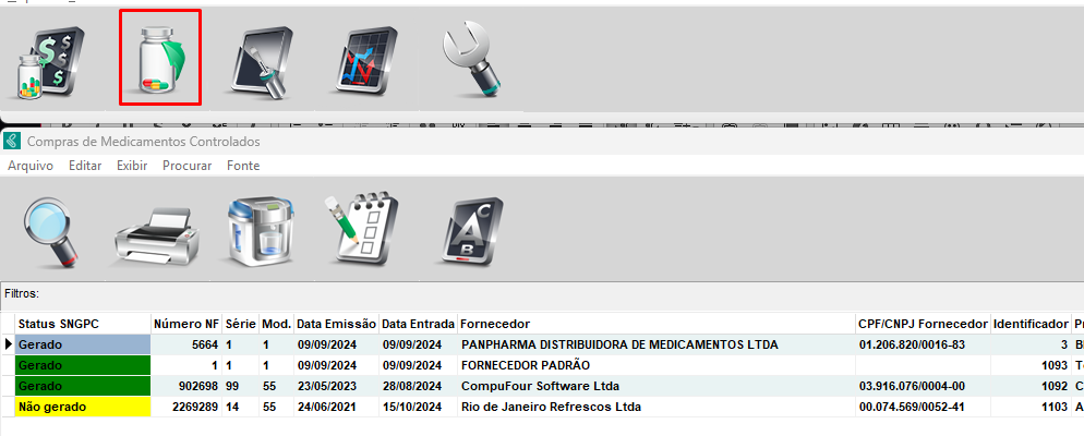 Nesta aba serão listadas todas as notas de entrada que contêm medicamentos controlados.