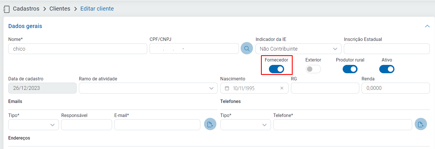 Primeiramente é necessário informar que o cliente é um fornecedor, para isso, acesse Cadastros - Clientes, clique sobre o cliente em questão e ative a função Fornecedor.