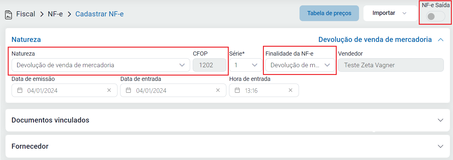 No campo Natureza da Operação escolha um CFOP de devolução, iniciado em 1 ou 2 (caso não tenha cadastrado clique aqui).
