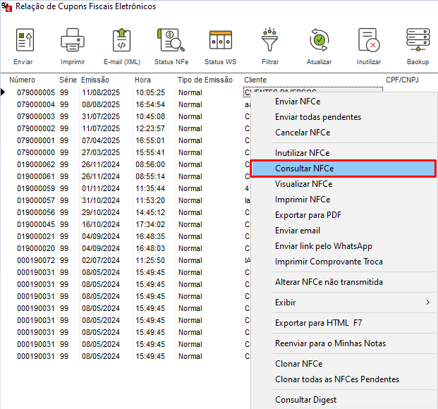 NFC-e: Caso a rejeição está sendo apresentada ao tentar inutilizar uma NFC-e é necessário acessar o Emissor de NFC-e, localizar a nota rejeitada, clicar com o botão direito e selecionar a opção Consultar NFC-e