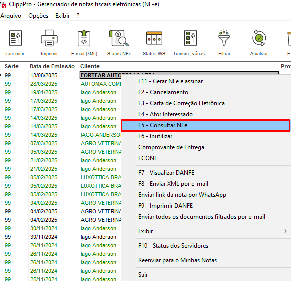 NF-e: Caso a rejeição está sendo apresentada ao tentar inutilizar uma NF-e é necessário acessar o Gerenciador de NF-e, localizar a nota rejeitada, clicar com o botão direito e selecionar a opção Consultar NF-e