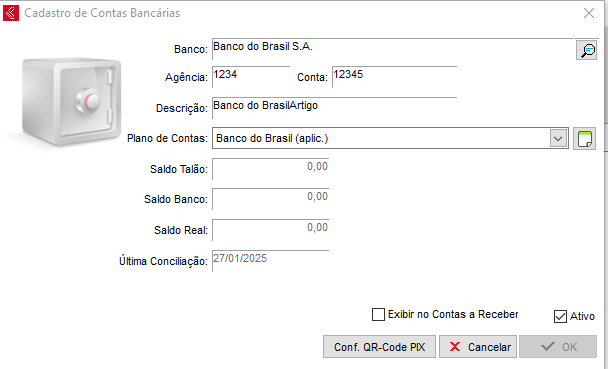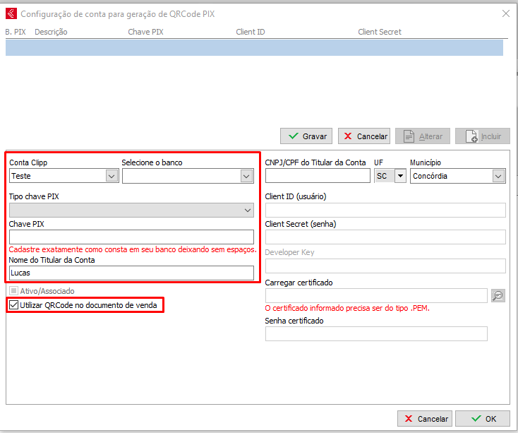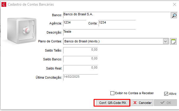 Tendo as chaves, é necessário configurar no sistema, para isso acesse a tela de cadastro de conta bancária e clique na opção de Conf. QR-code PIX, basta clicar em incluir.