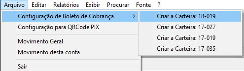 Selecione o menu Arquivo > Configuração de Boleto de Cobrança > Criar a Carteira (Carteira repassada pelo banco).