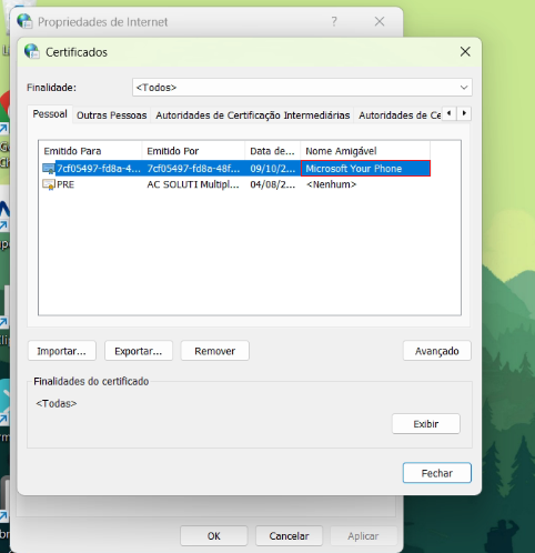 Remova todos os certificados da aba Pessoal com o nome amigável "Miscrosoft..." e confira se o seu certificado apresenta na aba Pessoal, caso não esteja, reinstale com o auxilio do seu contador ou com a certificadora.