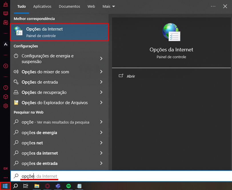 Acesse o Menu iniciar do Windows e pesquise Opções da Internet.