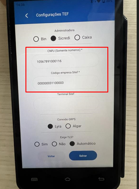 Abrirá as configurações, onde terá de preencher o CNPJ da empresa, e o código do estabelecimento, o mesmo que foi demostrado aonde localizar no início do artigo.