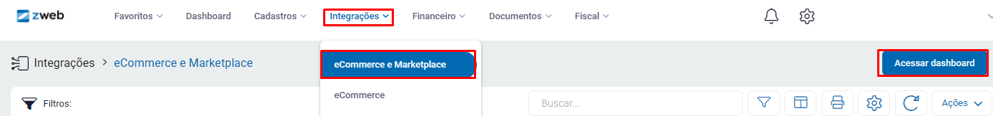 Após o item ter sido cadastrado no Zhub, acesse a aba Integrações > eCommerce e Marketplaces > Acessar Dashboard