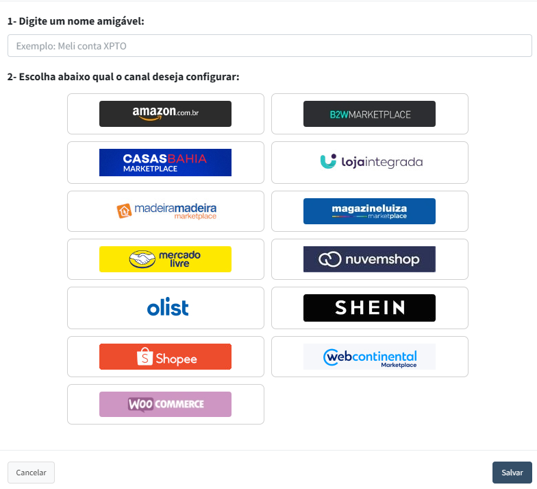 Informe o nome do Marketplace e selecione o canal que deseja configurar.