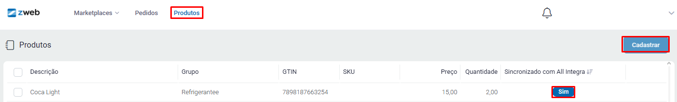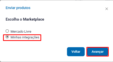 Para enviar o produto ao e-commerce e marketplace, clique em Produto > Selecione o Produto > Cadastrar > Minhas Integrações > Avançar, irá ficar com status Sincronizado como SIM