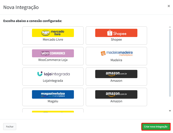 Acesse o menu Integrações > Nova Integração > selecione o Canal de Venda configurado anteriormente e clique em Criar nova integração