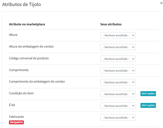 Na imagem acima, é apresentado informativos como Atributos, essas informações são referentes a campos específicos em diferentes marketplaces, e dependendo da categoria e markteplace, terá uma quantidade de atributos obrigatórios, como no exemplo acima,
