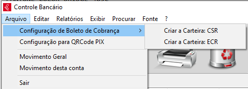 Selecione o menu Arquivo > Configuração de Boleto de Cobrança > Criar a Carteira (Carteira repassada pelo banco).