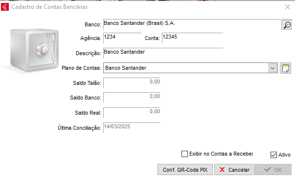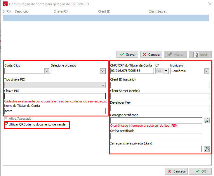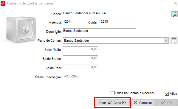 Tendo as chaves, é necessário configurar no sistema, para isso acesse a tela de cadastro de conta bancária e clique na opção de Conf. QR-code PIX, basta clicar em incluir.