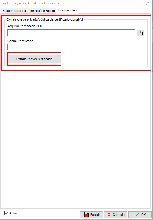 Em seguida acesse a aba ferramentas, selecione o seu certificado digital (Mesmo utilizado para emissão de documentos fiscais), informe a senha do mesmo e clique em Extrair Chave/Certificado.
