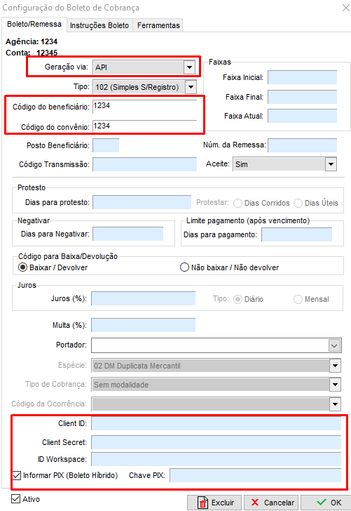 Após isso será necessário o preenchimento dos dados referente aos códigos que irão efetuar a comunicação via API com o banco, portanto estes códigos devem ser preenchidos igual a forma repassada pelo banco.