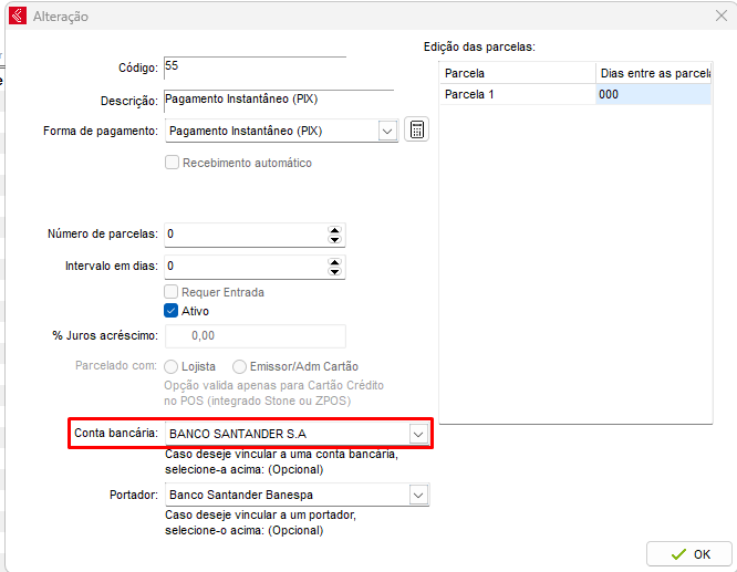 Após definir as configurações, para realizar o PIX no PDV, é necessário vincular a conta bancária nos parcelamentos.