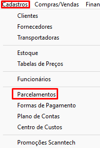 Clique em Cadastros > Parcelamentos e localize o PIX