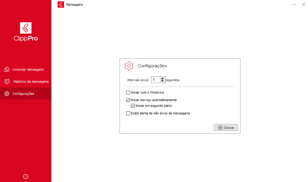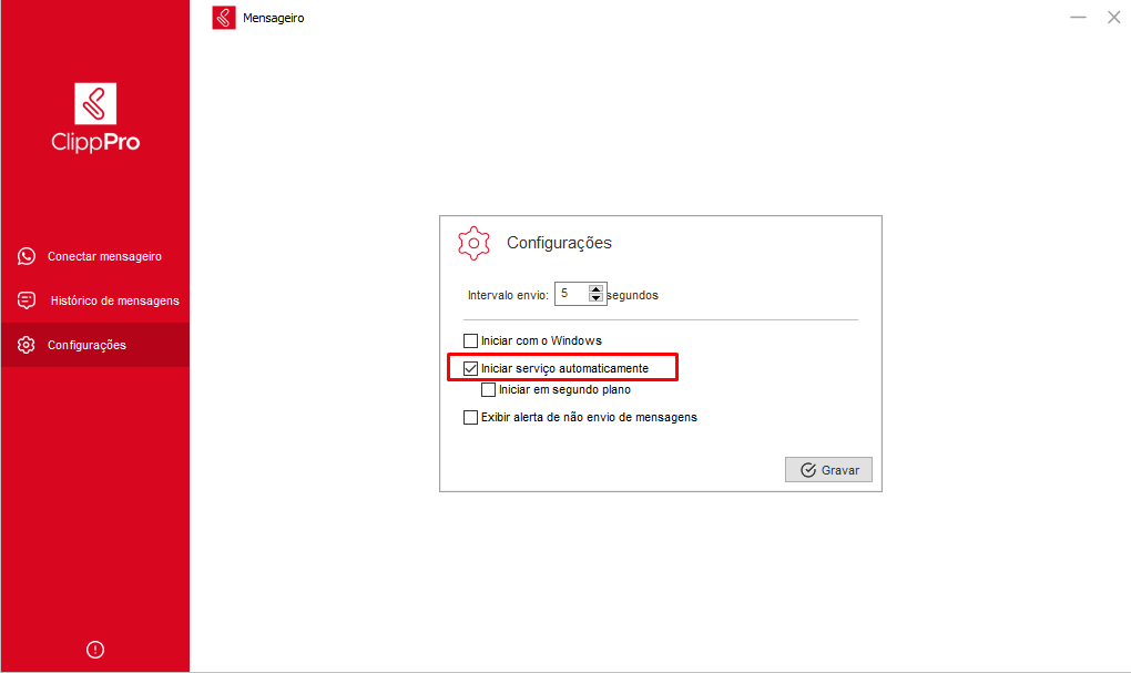 Marcando a opção de “Iniciar serviço automaticamente”, ao abrir a janela do mensageiro, ele já irá efetuar a tentativa de conexão com o serviço do WhatsApp, conseguindo se conectar ele irá iniciar automaticamente o envio das mensagens:
