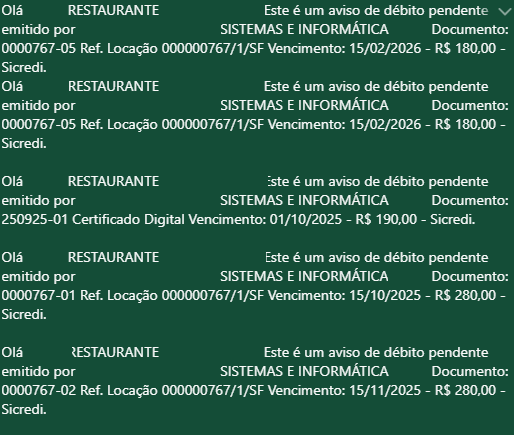 Com a função de Agrupar Registros do mesmo cliente marcada, o sistema não irá agrupar todas as informações em uma única mensagem. Em vez disso, ele enviará uma mensagem individual para cada conta simultaneamente. Dessa forma, é realizada apenas uma requisição ao mensageiro, em vez de diversas contas separadas.