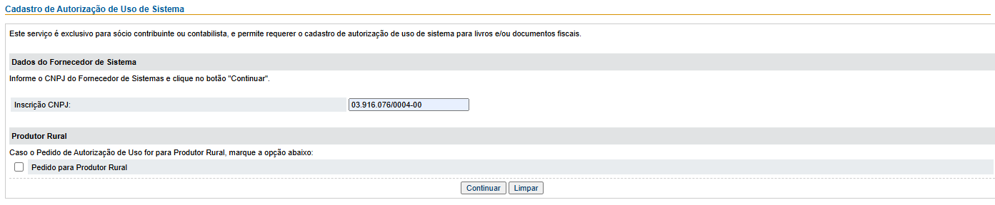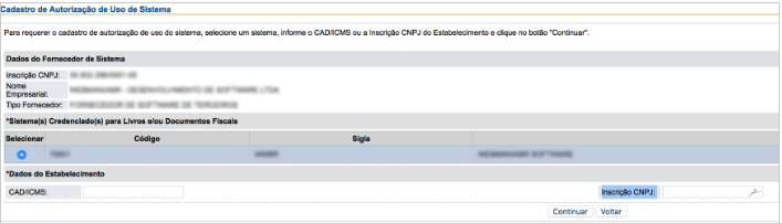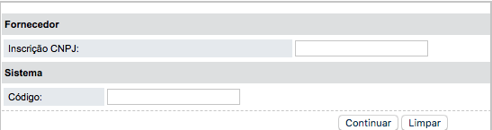 Em seguida informe o código do sistema que utiliza e que deseja realizar a autorização e o CNPJ da Fornecedora: