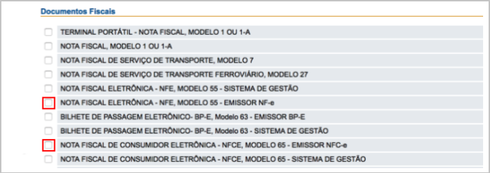 Em seguida selecione os documentos fiscais a serem liberados, modelo 55 e 65.