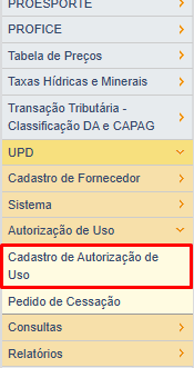 Em seguida acesse a aba UPD > Autorização de Uso > Cadastro de Autorização de Uso