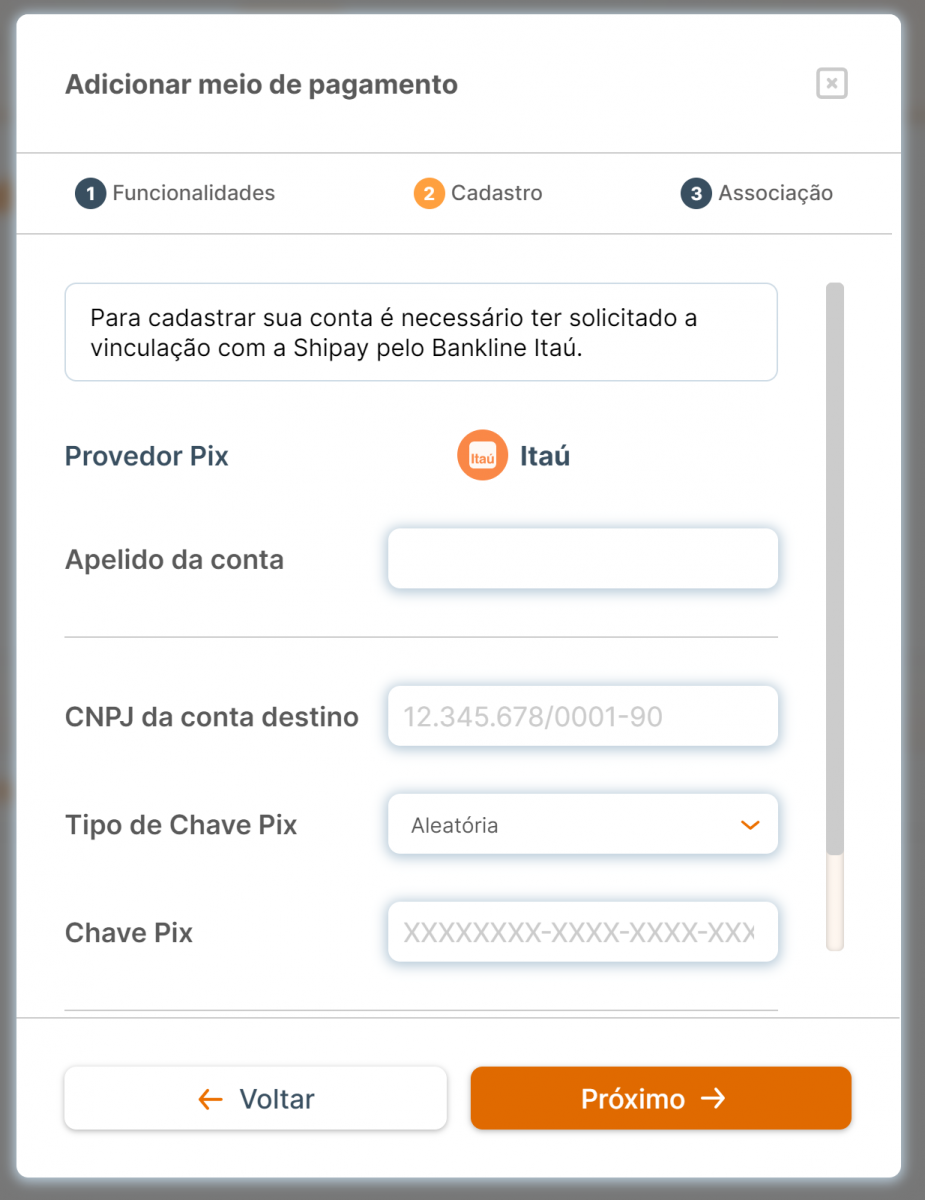 No passo 2, será apresentada a opção do PIX do Itaú.