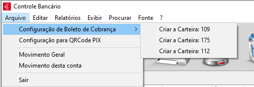 Selecione o menu Arquivo > Configuração de Boleto de Cobrança > Criar a Carteira (Carteira repassada pelo banco).