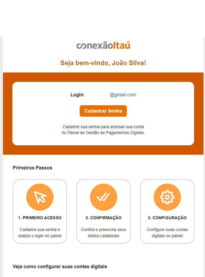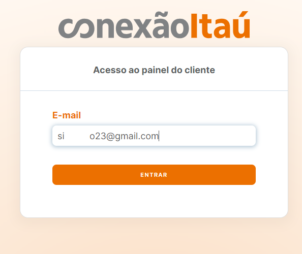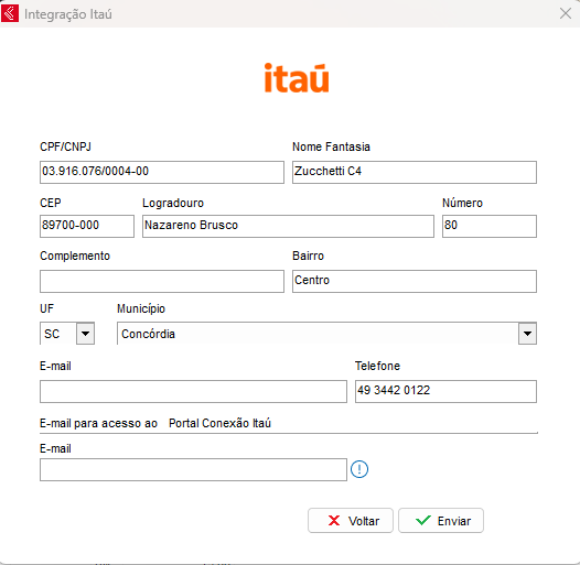 É necessário cadastrar um e-mail para acesso ao portal da Integração Itaú, este e-mail pode ser o mesmo e-mail dos dados gerais, ou poderá ser um e-mail diferente.