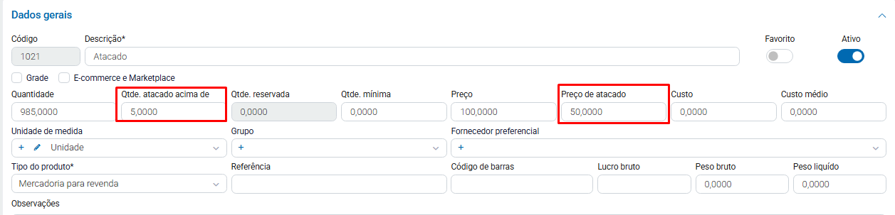Acessando o cadastro do produto é possível identificar dois campos importantes "Qtde. atacado acima de" e "Preço de atacado".