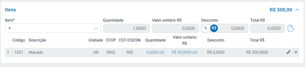 Durante o lançamento dos itens, ao inserir uma quantidade igual ou superior ao valor definido no campo Qtde. atacado acima de, o sistema aplicará automaticamente o Preço de atacado, mesmo que o valor unitário inicialmente exibido seja o padrão.