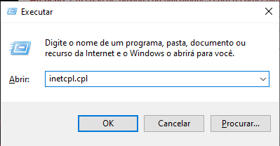 Primeiramente desconecte o certificado A3 do computador e após isso pressione Windows + R, digite inetcpl.cpl e pressione Enter.