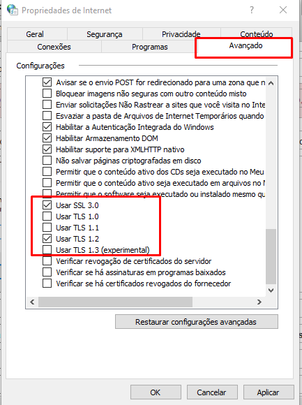 Em propriedades da internet, clique na aba Avançado. Desmarque as opções Usar TLS 1.0 e Usar TLS 1.1 e selecione as opções Usar SSL 3.0 e Usar TLS 1.2.