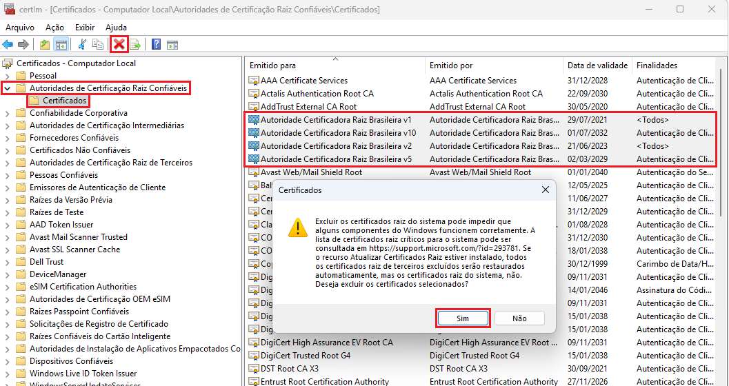 Acesse Autoridades de Certificação Raiz Confiáveis > Certificados. Selecione os certificados da Autoridade Certificadora Raiz Brasileira e clique no botão Excluir > Sim.