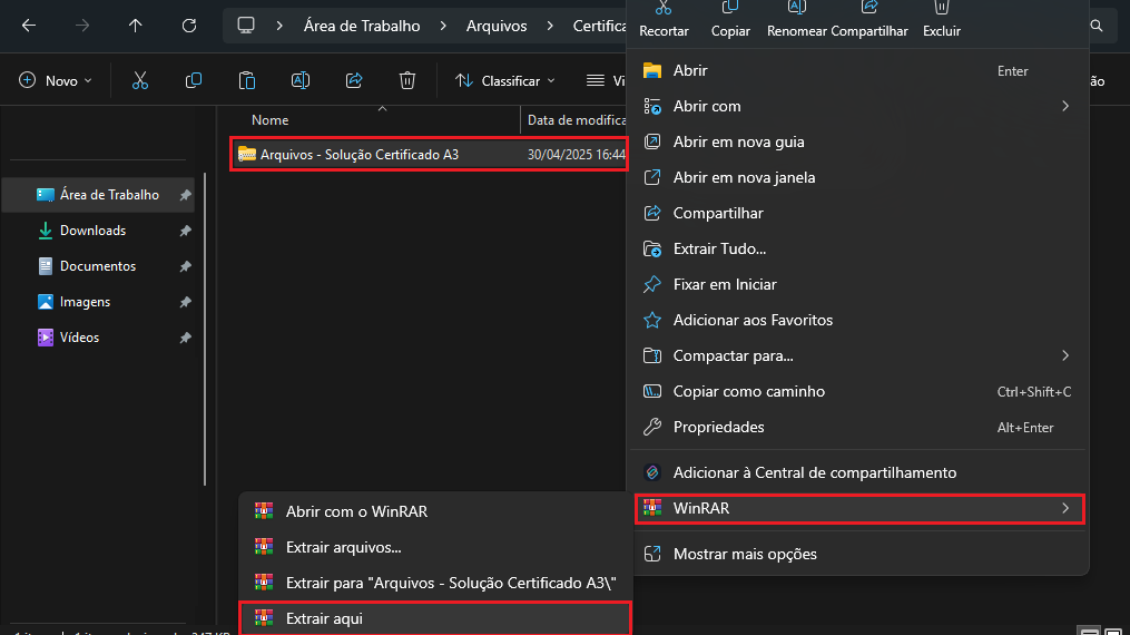 Ao instalar o arquivo, extraia os arquivos da pasta baixada, clicando em Arquivos - Solução Certificado A3, clique com o botão direito do mouse, WinRAR > Extrair aqui para descompactar o arquivo.