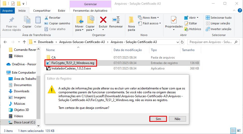 Após concluir abra o arquivo FixCrypto_TLS_2_Windows, será apresentado uma mensagem, na qual poderá seguir clicando em Sim.