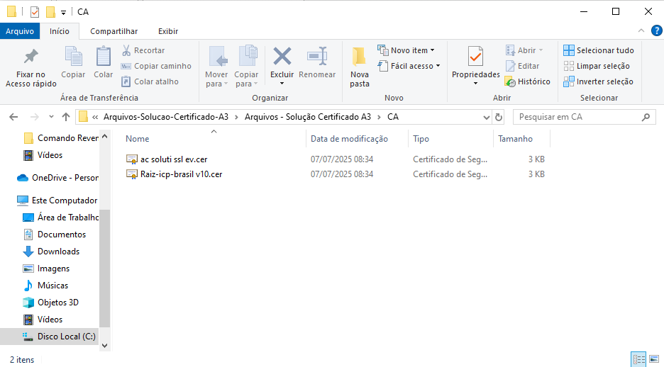 Ao finalizar será apresentado a mensagem de confirmação, apenas clique em OK e prossiga acessando a pasta CA, nessa pasta constará dois certificados para a instalação.