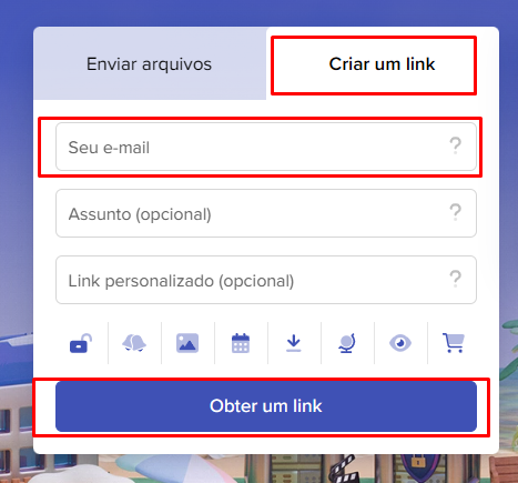 6. Depois de selecionar o arquivo compactado, clique em Criar um Link, preencha com seu email e depois Obter um Link