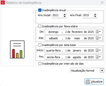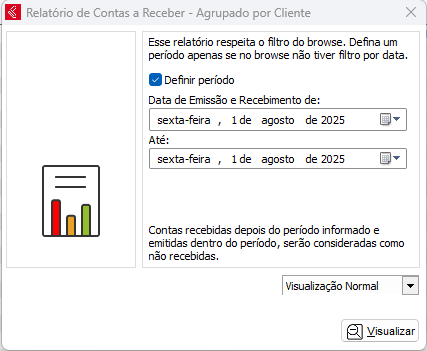 Esse relatório irá mostrar contas a receber, contas recebidas, contas atrasadas e contas em carência, de acordo com o período selecionado.