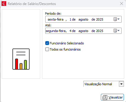 Neste relatório serão apresentados todos os descontos registrado para o funcionário, sendo feito o calculo do salário menos todos os descontos registrados. Sendo opcional gerar o relatório de todos os funcionários ou de apenas um em específico, também é possível determinar o ano e mês.