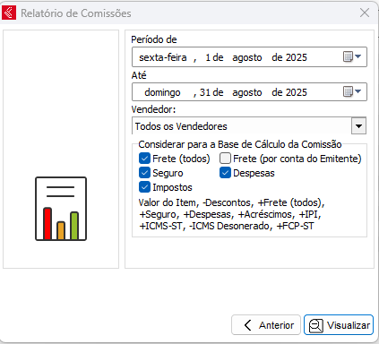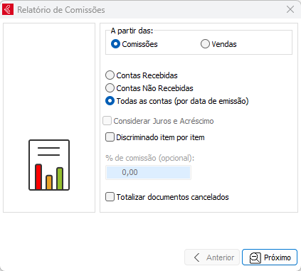 O relatório de comissões serve para determinar a comissão para os vendedores, ao optar por esse relatório é disponibilizado duas opções: relatório por comissões ou por vendas. O relatório por comissões pode ser gerado a partir das contas recebidas, não recebidas ou por todas (por data de emissão), o percentual para calcular a comissão será o percentual indicado no cadastro do vendedor ou o percentual indicado no cadastro do produto (quando houver). Já o relatório por vendas, ao marcar essa opção será disponibilizado o campo para preencher o percentual de comissão que deseja ser calculado.