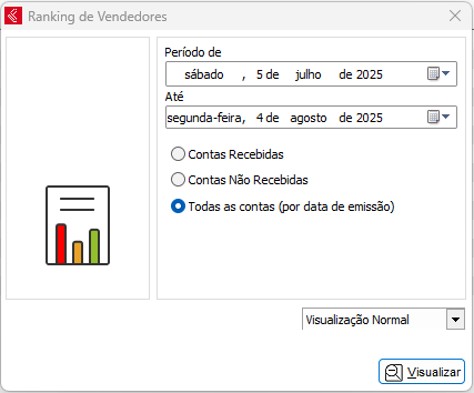 Esse relatório mostrará o ranking de colocações entre em vendedores no período informado, sendo possível gerar o relatório a partir de contas recebidas, contas não recebidas ou todas (por data de emissão).
