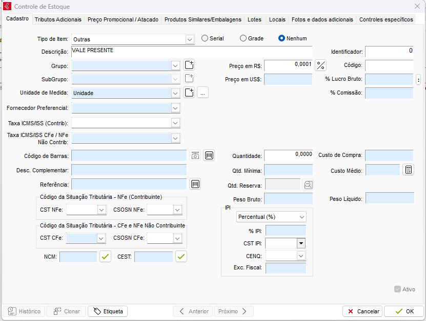 Para preenchimento correto das tributações, precisa ser verificado com a Contabilidade.