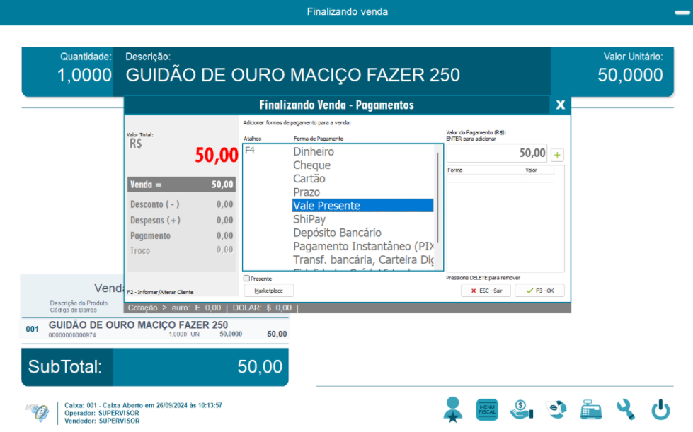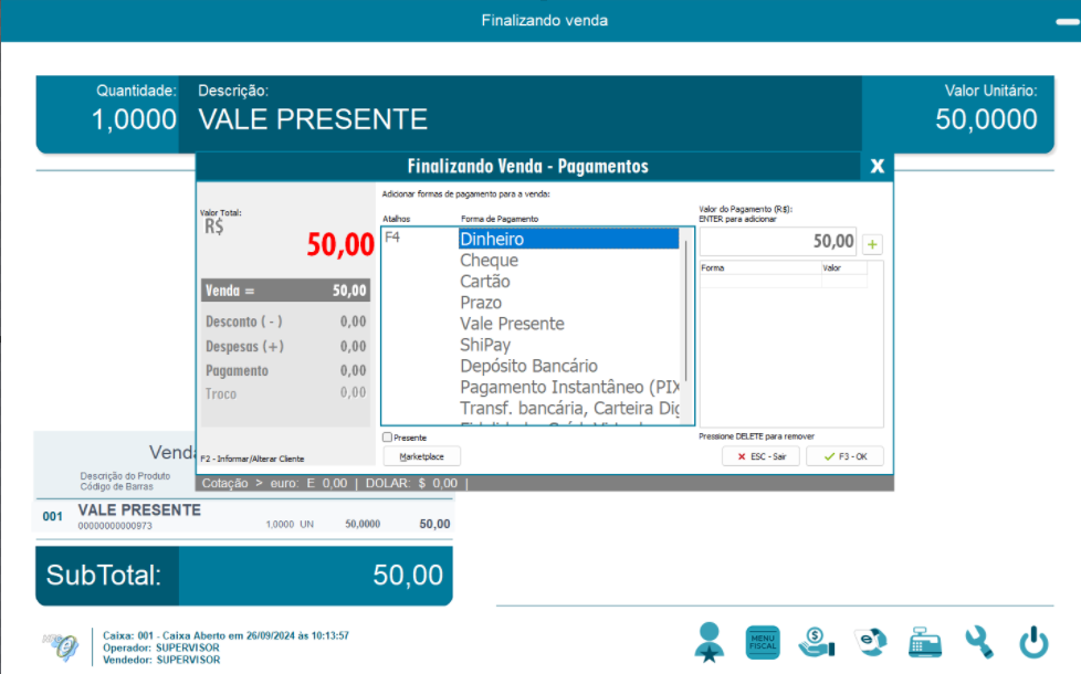 E nesse momento a forma de pagamento precisa ser Vale Presente, em seguida finalize a venda.