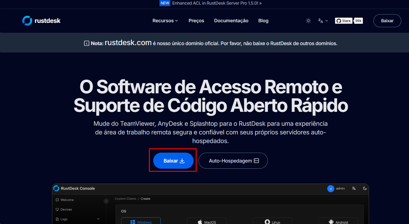 Para a correta instalação do RustDesk, deve-se acessar o link https://rustdesk.com/pt