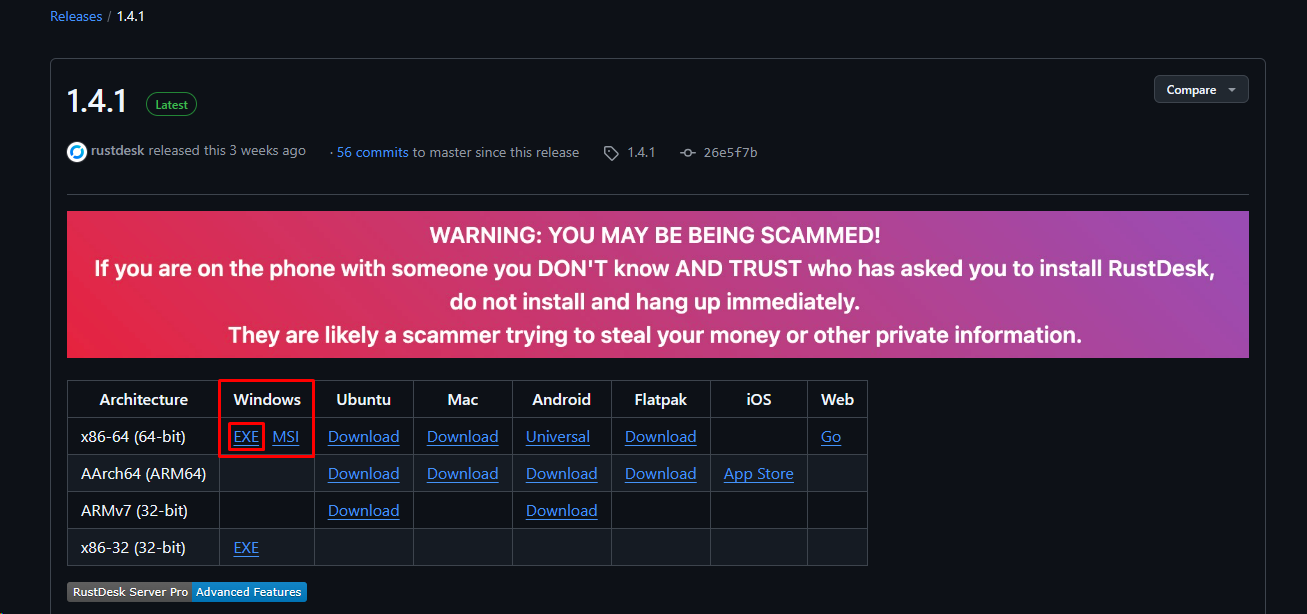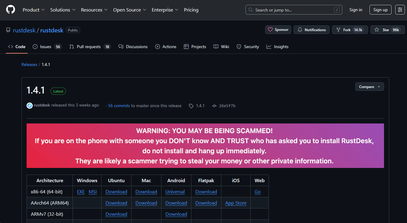 Em seguida uma nova página abrirá: https://github.com/rustdesk/rustdesk/releases/tag/1.4.1
