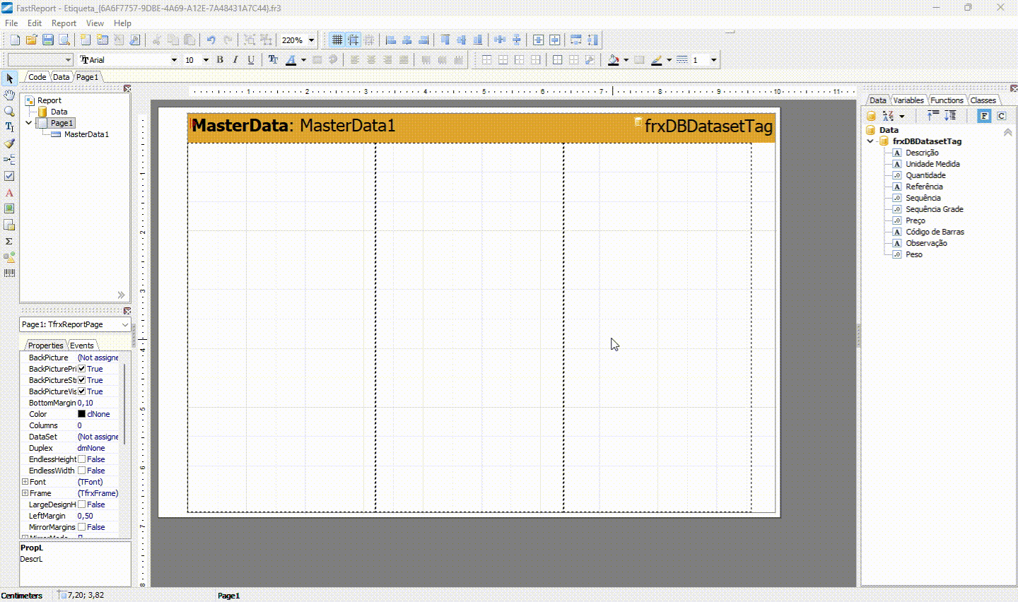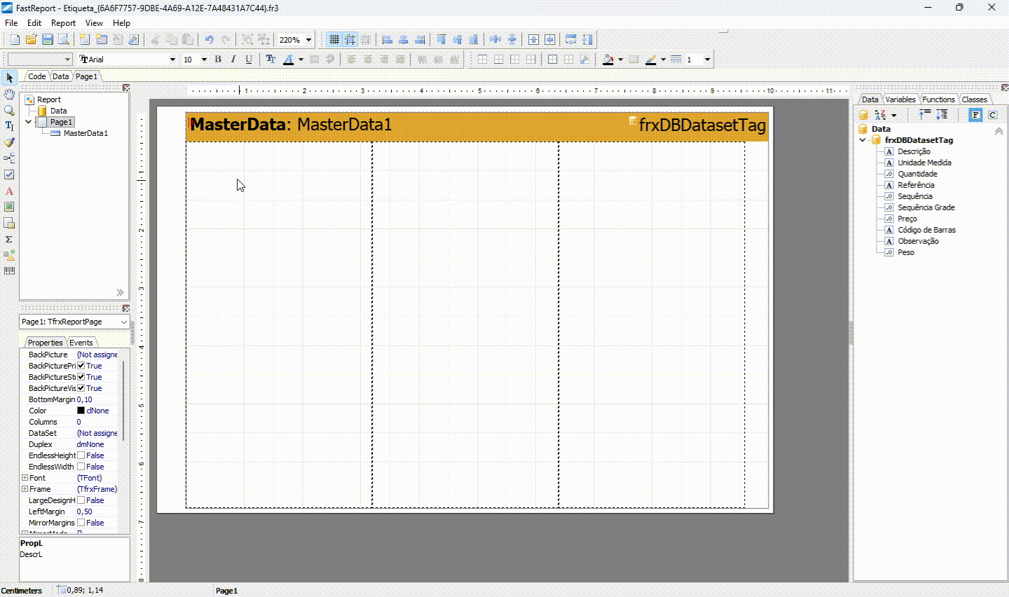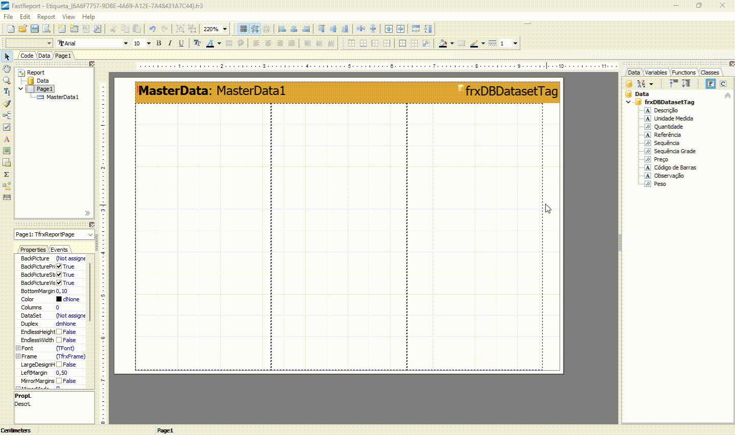 Para a definição das colunas, primeiro selecione a aba MasterData1, abaixo de Page1, onde foi configurado o tamanho.