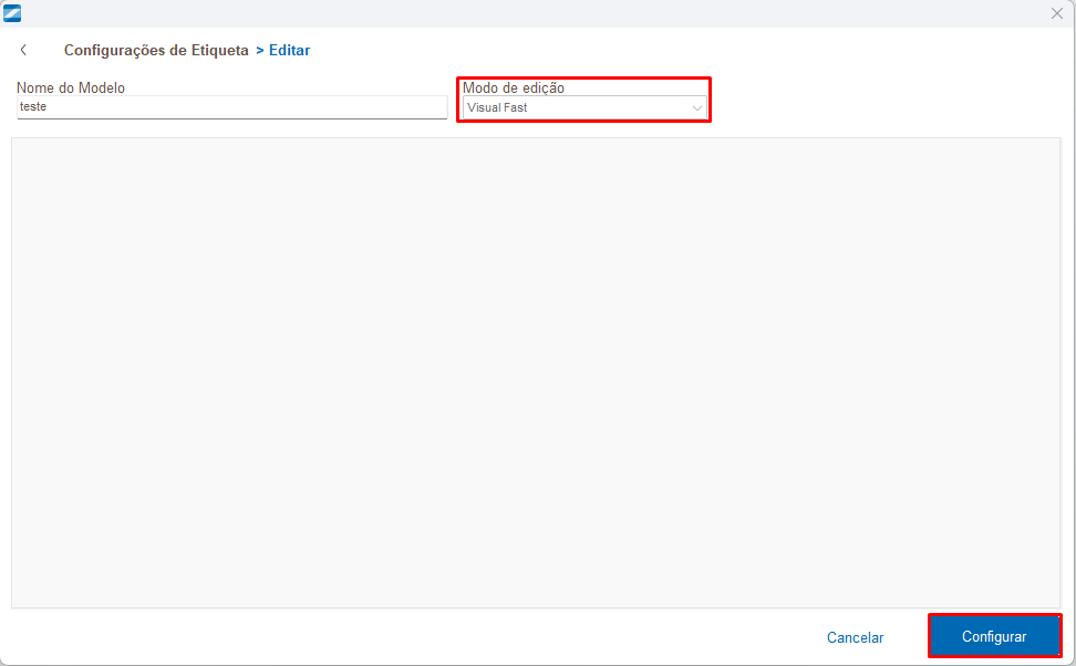 Defina o nome da etiqueta e selecione o Modo de edição como Visual Fast e pressione em Configurar.